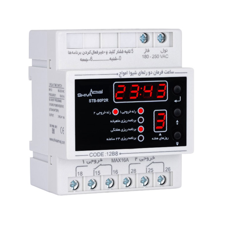 ساعت فرمان دو رله ای شیوا امواج دستگاهی با ۹۰ برنامه قابل تنظیم بوده که هر برنامه، دارای یک زمان روشن و یک زمان خاموش است .این دستگاه ،در دوره های زمانی روزانه،هفتگی و ماهانه قابل تنظیم می باشد.همچنین میتوان برای هر برنامه یکی از خروجی ها یا هر دو را انتخاب نمود.